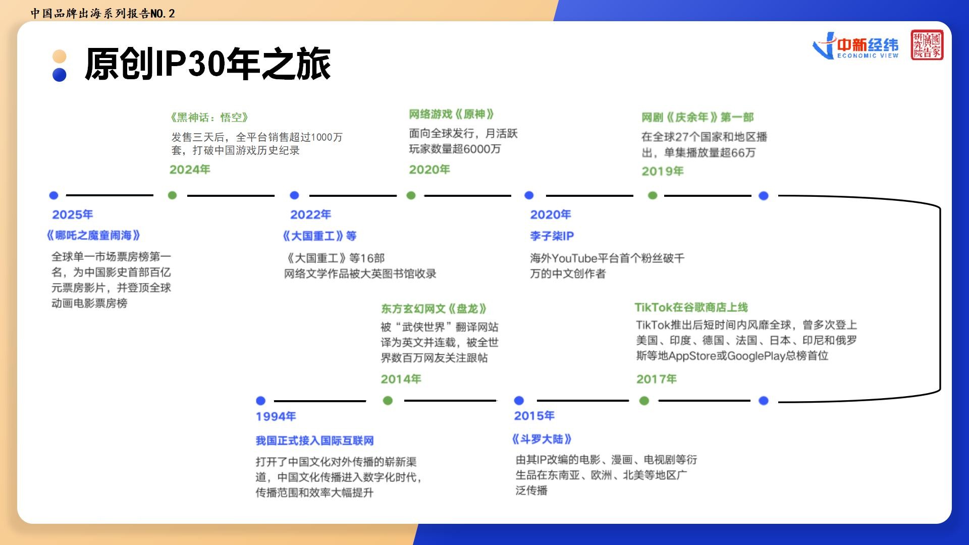 《报告》指出,近30年来,中国原创IP的出海之路上留下了很多具有重要意义的印记。2025年,《哪吒之魔童闹海》以超过155亿元的票房登顶全球动画电影榜,并以非英语电影身份进入全球电影票房前五,打破了好莱坞垄断局面,成为中国原创IP出海的里程碑。2024年,《黑神话:悟空》发售仅3天全平台销量就超过1000万套,创造中国3A游戏历史纪录。