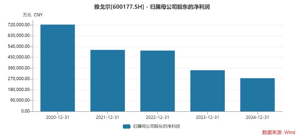 此后,这个“男衬衫、男西装都稳居市占率第一”的服装龙头,净利润曲线却划出惊人的抛物线。Wind数据显示,2020-2024年,雅戈尔的归母净利润分别为72.36亿元、51.27亿元、50.68亿元、34.34亿元和27.67亿元,4年降幅逾六成。