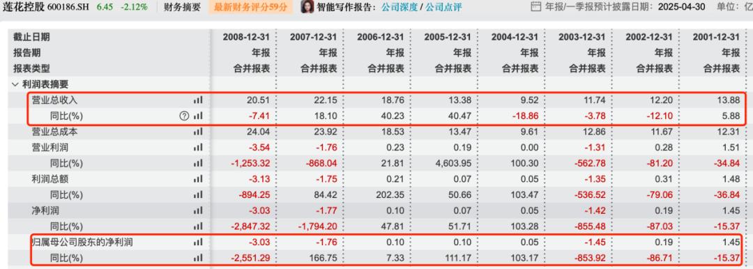 2001年开始,莲花控股的归母净利润开始走下坡路。2003年,公司归母净利润亏损1.45亿元,出现了上市以来的首次亏损。