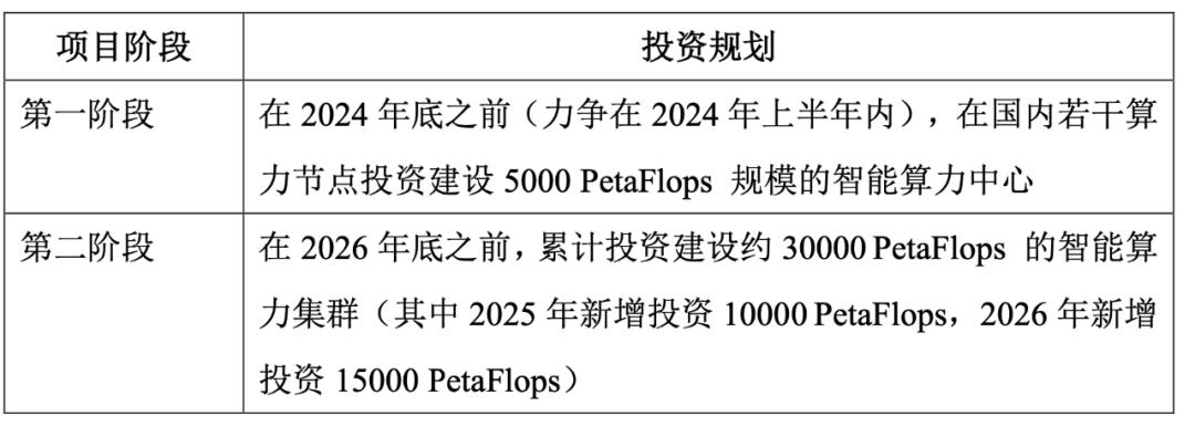 根据莲花控股在公告中披露的投资计划,公司的算力租赁项目分为两阶段。第一阶段将在2024年底之前在国内若干算力节点投资建设5000 PetaFlops规模的智能算力中心;第二阶段将在2026年底之前,累计投资建设约30000 PetaFlops的智能算力集群。