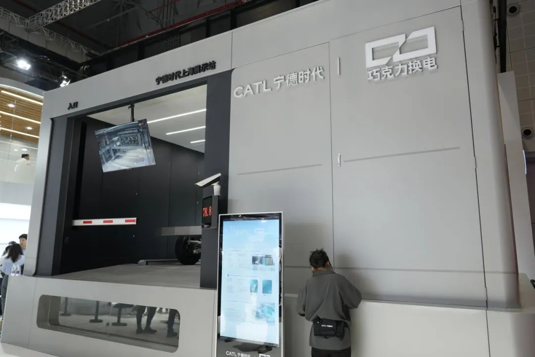 另一边,宁德时代的换电站也在机械声中“不厌其烦”地为观众演示着,看似差不多的银灰色集装箱造型,却有着“相似又不同”的换电方式。