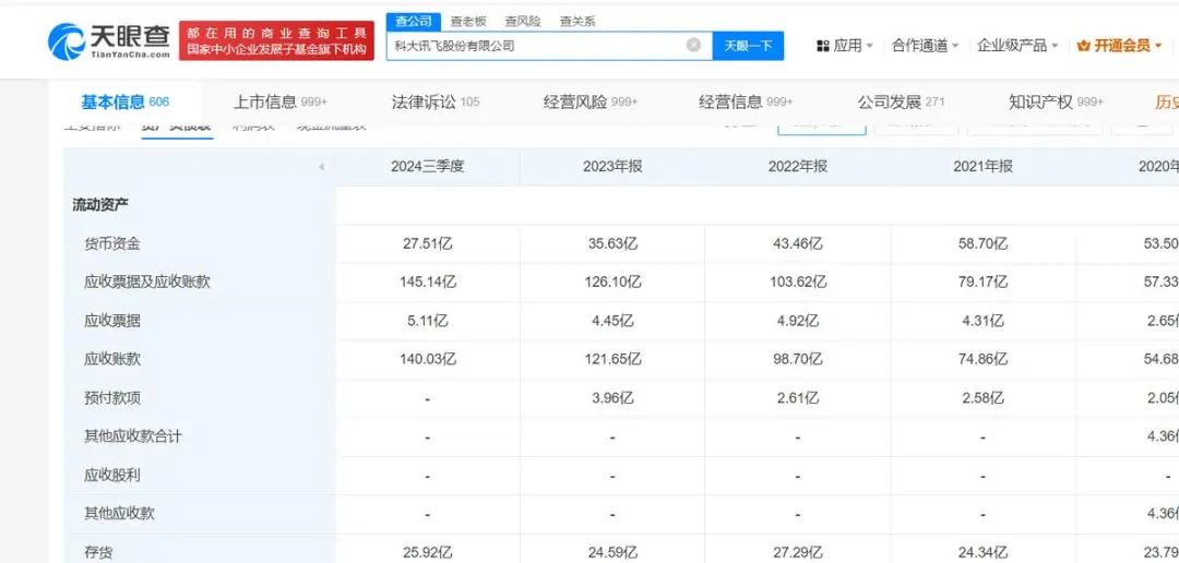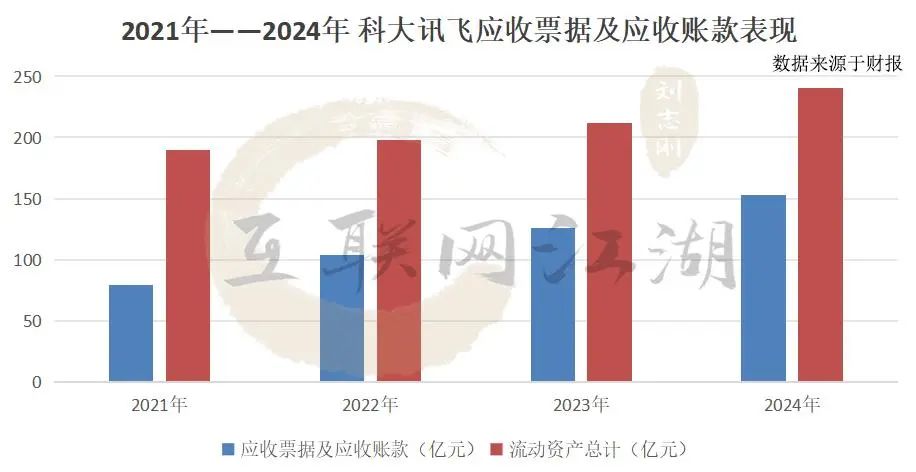 2020年,科大讯飞的应收票据及应收账款总额尚且为57.33亿元,但现在,截止到2024年末,科大讯飞的“应收票据及应收账款”却已经达到了153.1亿元,整体占流动资产的63.63%。