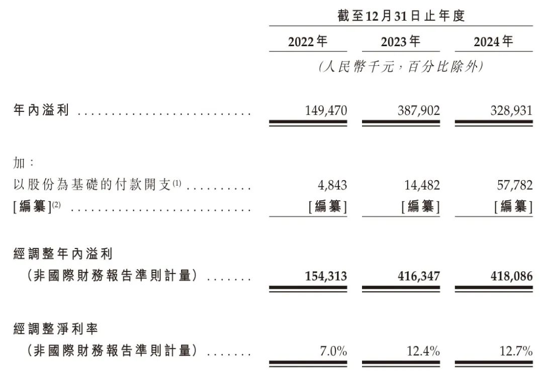 沪上阿姨2022年、2023年、2024年经调整利润分别为1.54亿元、4.16亿元、4.18亿元;经调整利润率分别为7%、12.4%、12.7%。