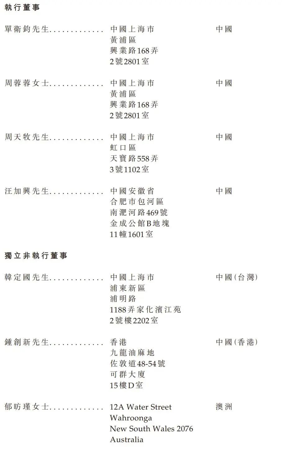沪上阿姨执行董事分别为单卫钧、周蓉蓉女士、周天牧、汪加兴;独立非执行董事分别为韩定国、钟创新、郁昉瑾女士。