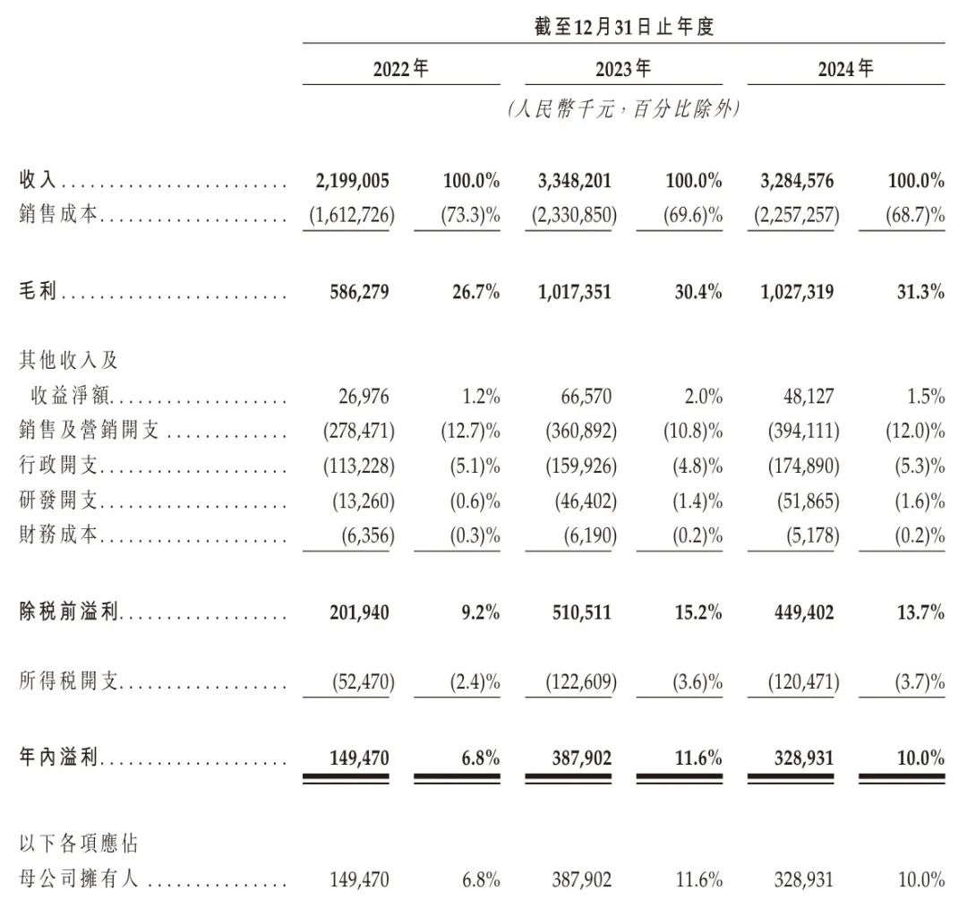 沪上阿姨2022年、2023年、2024年年内盈利分别为1.49亿元、3.88亿元、3.29亿元;年内盈利率分别为6.8%、11.6%、10%。