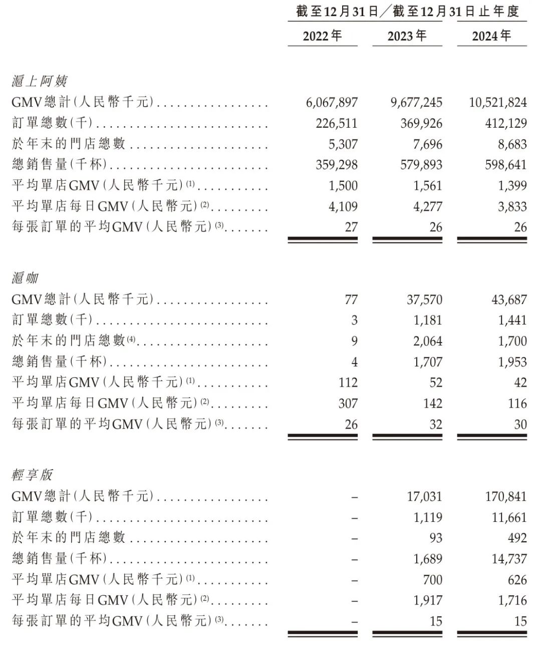 沪上阿姨门店2024年平均单店GMV为139.9万元,较上年同期的156.1万元下降10.4%;平均单店每日GMV为3833元,较上年同期的4277元下降10.38%。