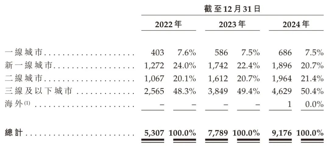 截至2024年12月24日,沪上阿姨在一线城市有门店686家,占比为7.5%;来自新一线城市的门店有1896家,占比为20.7%;来自二线城市的门店数为1964家,占比为21.4%;来自三线及以下城市的门店数量为4629家,占比为50.4%。