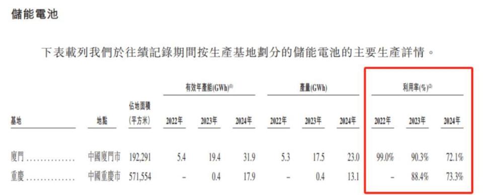 更重要的是,储能行业已经进入产能过剩的行业周期。《招股书》显示,海辰储能目前已在中国建立两个生产基地,分别位于福建省厦门市及重庆市,并正在山东菏泽建立第三个生产基地。厦门以及重庆基地的利用率分别由2023年的90.3%、88.4%,下滑至2024年的72.1%以及73.3%。