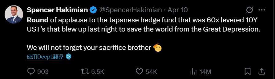 但机构却没这么好运了。次日,日本Tolou Capital的创始人斯宾塞·哈基米在推特上曝出,有日本对冲基金因为60倍杠杆押注10年期美债而爆仓。“它的爆仓让世界免于进入大萧条的时代。”他说道,“兄弟,我们不会忘记你的牺牲”。