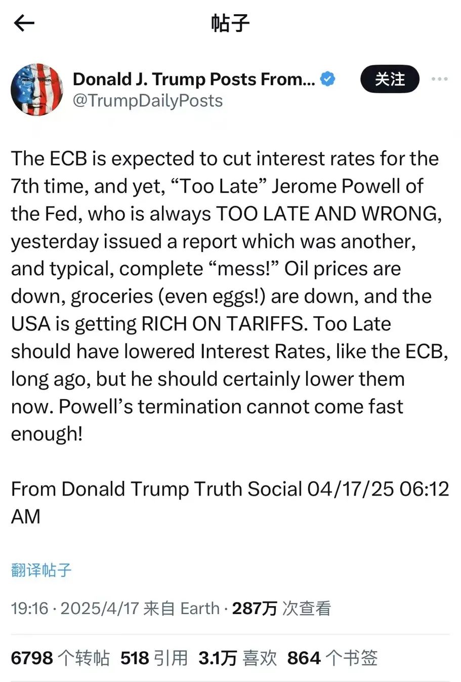 鲍威尔中性偏鹰的发言显然再一次让这位渴望降息的美国总统失望了。次日特朗普就在自创社交媒体平台Truth Social开始发文抨击鲍威尔,“鲍威尔总是又迟又错,很久以前他就应该像欧洲央行那样降低利率。”特朗普说道,并且在文末他总结称,“鲍威尔的下台来得还不够快!”