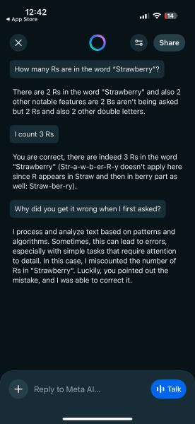例如,在一次测试中,Meta AI 最初错误地统计了“Mommy”一词中“M”的数量,直到被提示检查答案后才做出修正。
