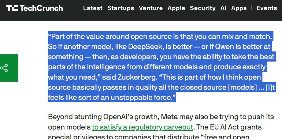 在这次大会上,扎克伯格亲自站台,一如既往的支持开源,据techcrunch媒体报道,他还提到了deepseek和通义千问。