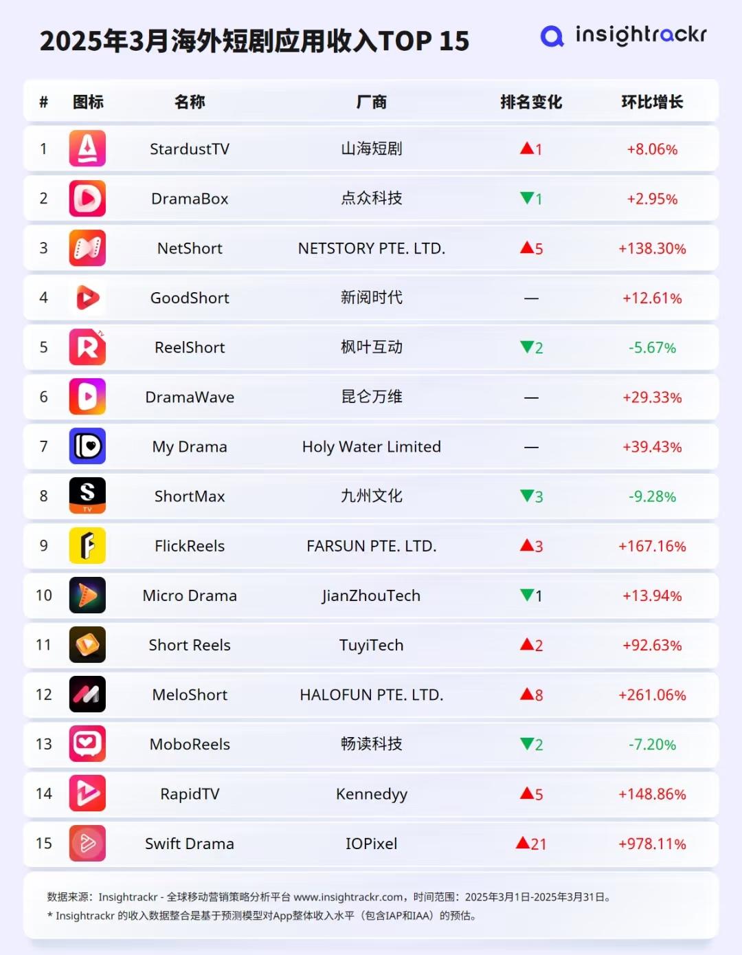 相较于已经被平台固定格局的国内市场,仍在发展中的海外市场除了是巨大的潜在增长空间,也有着相对开放的买量环境,这意味着小程序短剧公司在投流和运营上的能力有机会为他们在海外抢占先机。2024年,海外短剧APP的内购收入排名中,除了出海短剧先锋ReelShort外,点众的DramaBox和九州的ShortMax位列第一和第三。