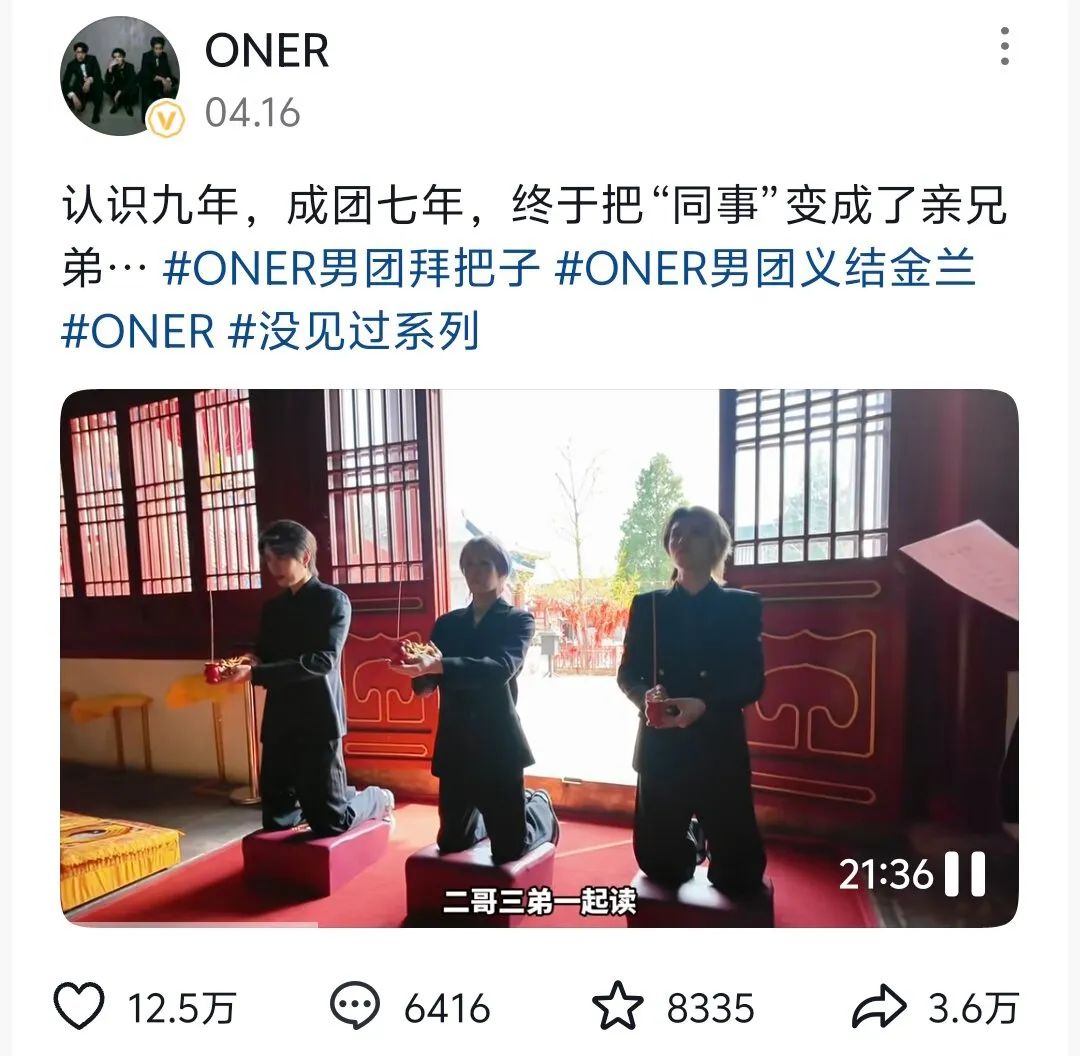 三名成员在关二爷面前结为异姓兄弟,互相鞠躬行礼、上香。 至截稿日,这条结拜vlog已经收获12.5万赞,3.6万转发。