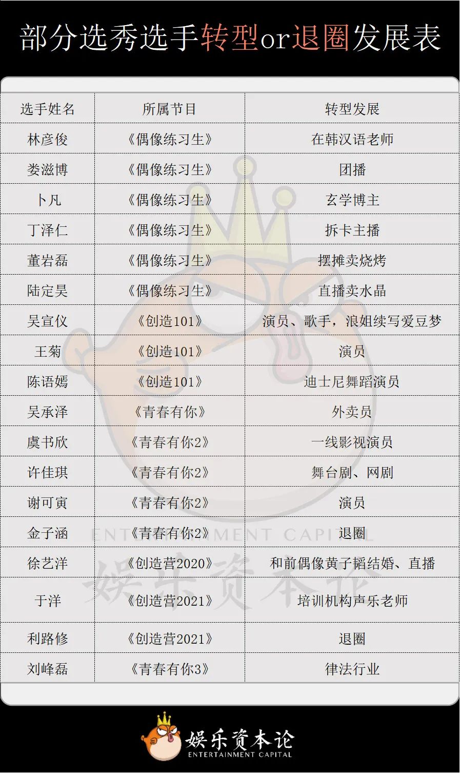 而同期选秀出身的金子涵、冯若航们,却困在转型失败的泥潭里: 有人退圈、有人“下海”、有人沦为数据泡沫中的幽灵。