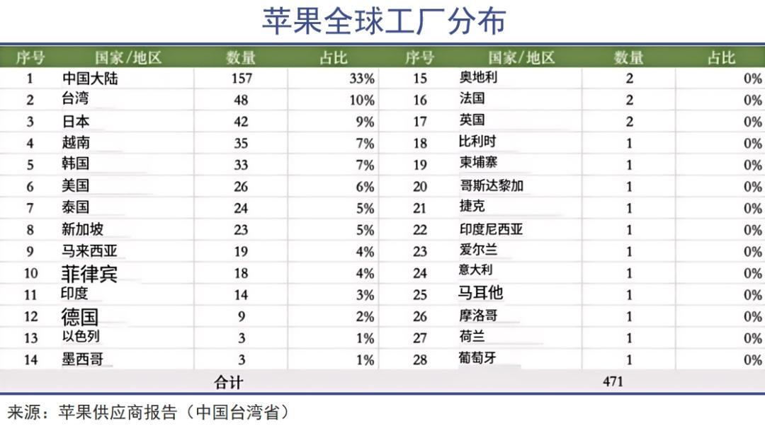 根据去年苹果公布的供应商资料,产业链187家核心企业里,中国大陆共有45家,加上台湾、香港企业共计91家,占比接近一半。