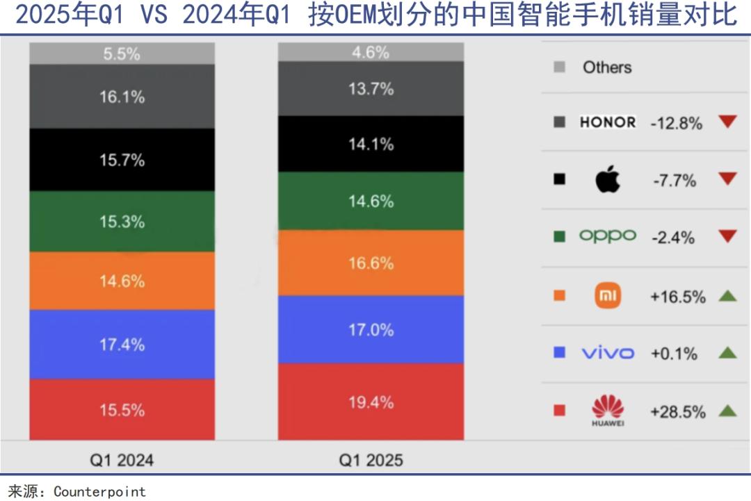 苹果在华最核心的竞争对手华为,在经历了5年的极限施压后浴火重生。今年一季度,华为以19.4%的市场份额拔得中国市场头筹,同比增幅达28.5%,小米增长16.5%,位居第三,苹果市场份额下滑7.7%,已经排到第五名。