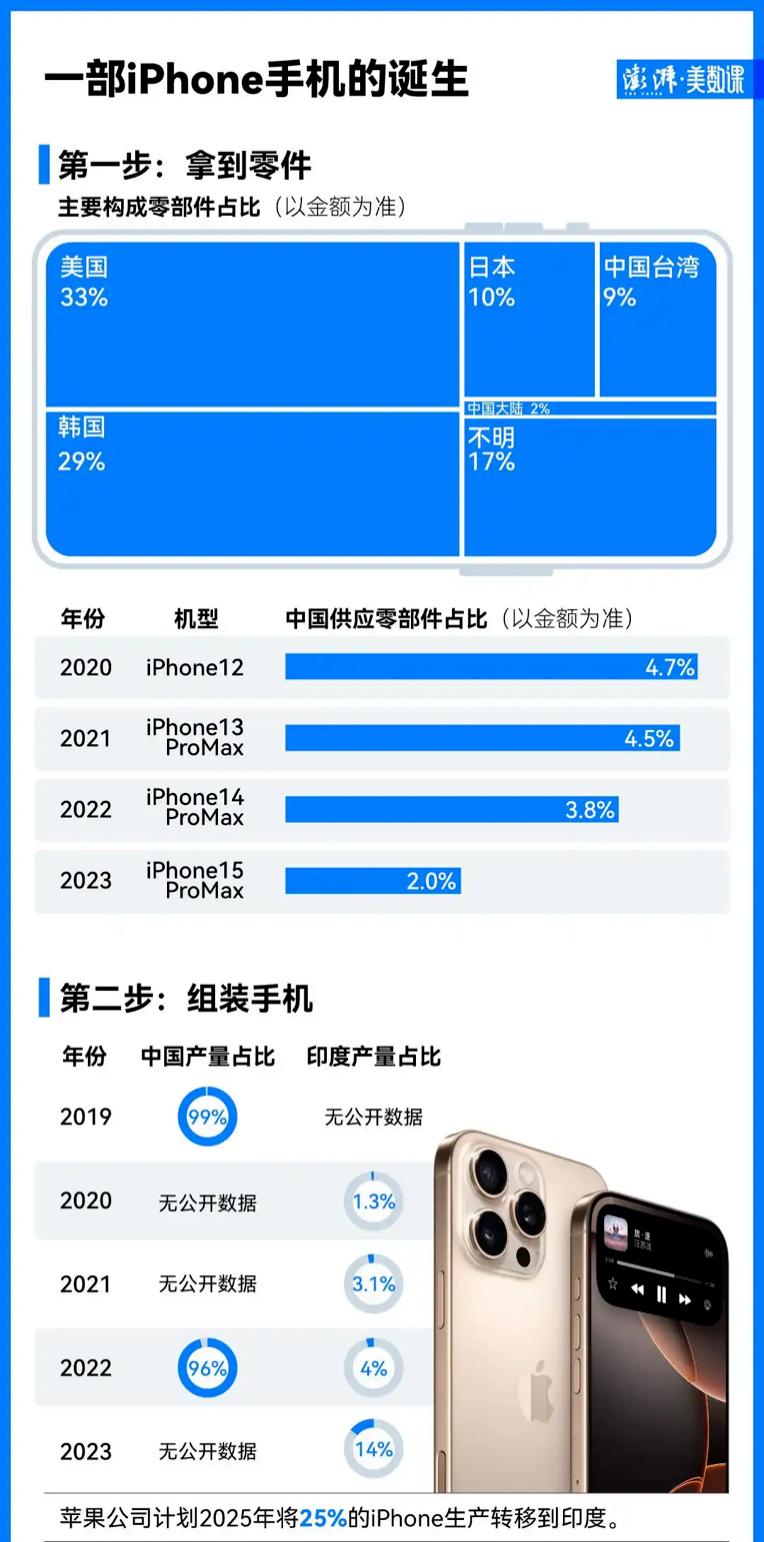 从iPhone全球产能分布来看,印度四年间从1%上升到14%,中国则从98%萎缩到85%。