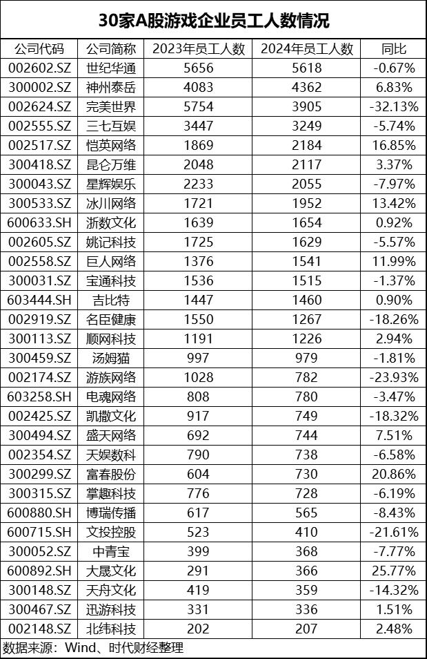 此外,游族网络(002174.SZ)、文投控股(600715.SH)2024年减员幅度均超过20%,分别约为23.93%、21.61%。