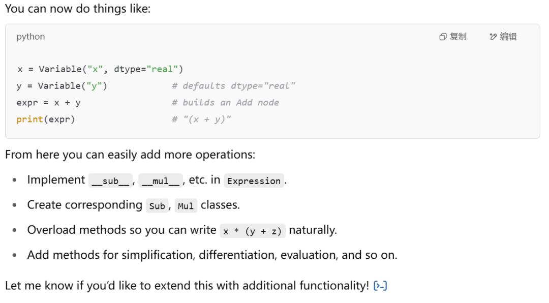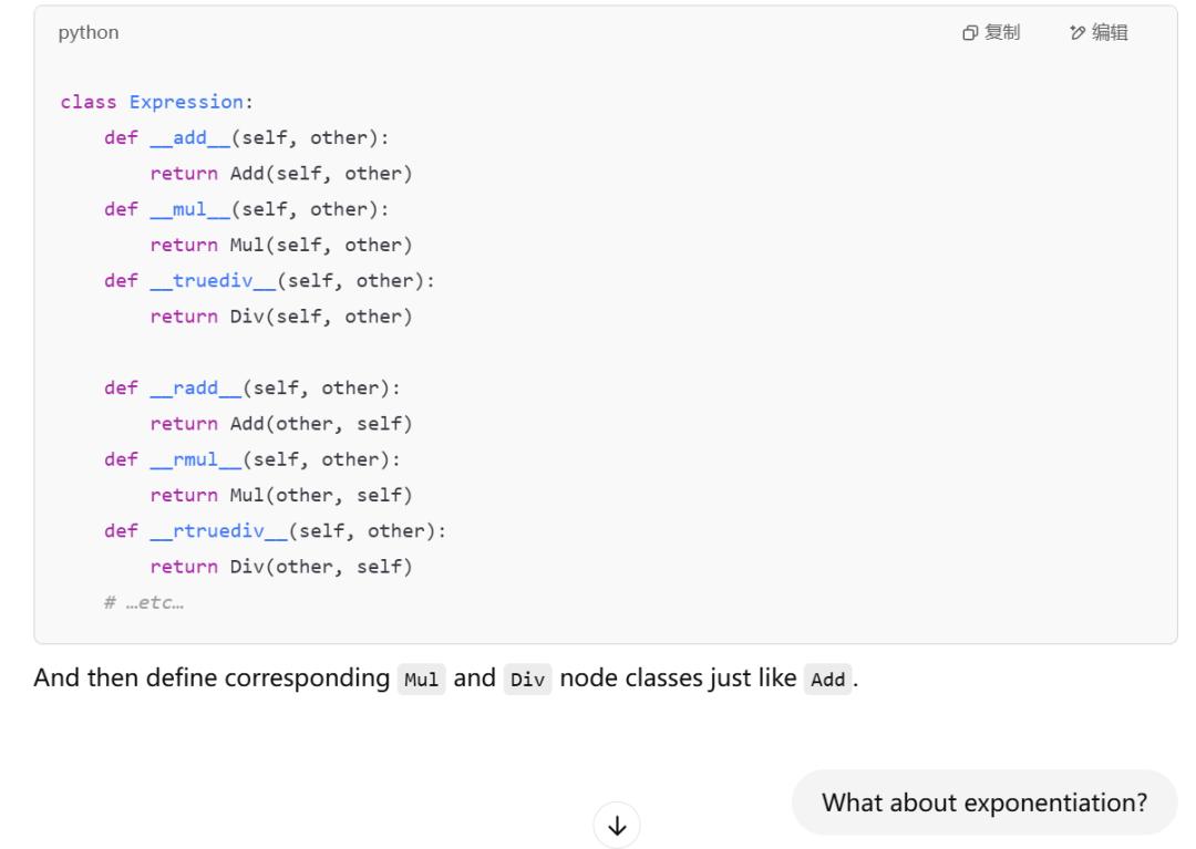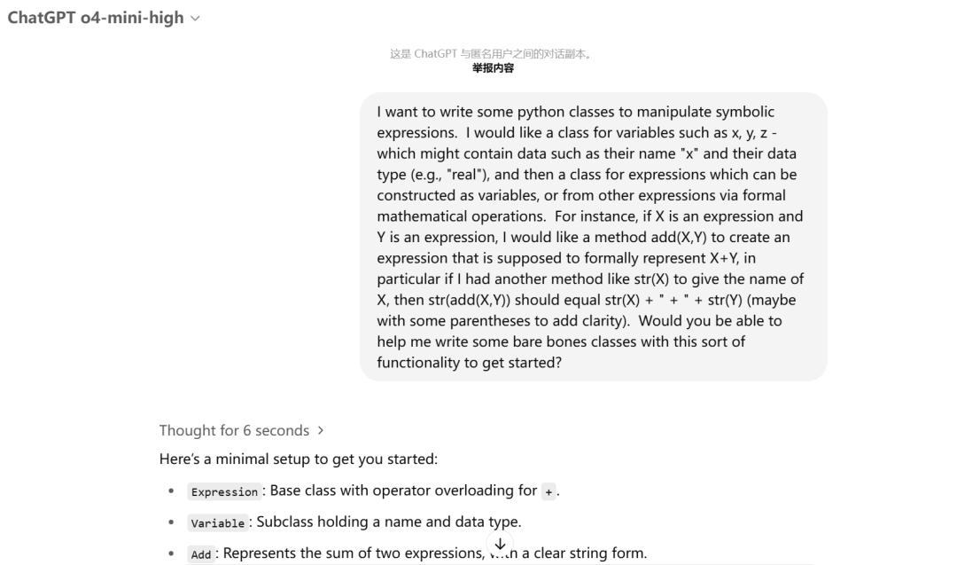 一开始,陶哲轩就对 ChatGPT 提出了自己的需求:「我想编写一些 Python 类来操作符号表达式。并且希望有一个表示变量的类,比如 x、y、z…… 你能帮我编写一些具有这种功能的基础类来入门吗?」