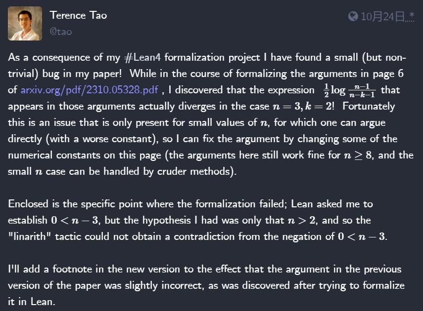 陶哲轩不止一次借助大模型进行研究,他曾在 GPT-4 的帮助下成功解决了一个数学证明题(GPT4 提出了 8 种方法,其中 1 种成功解决了问题),还在 AI 的帮助下发现了自己论文中的一处隐藏 bug。