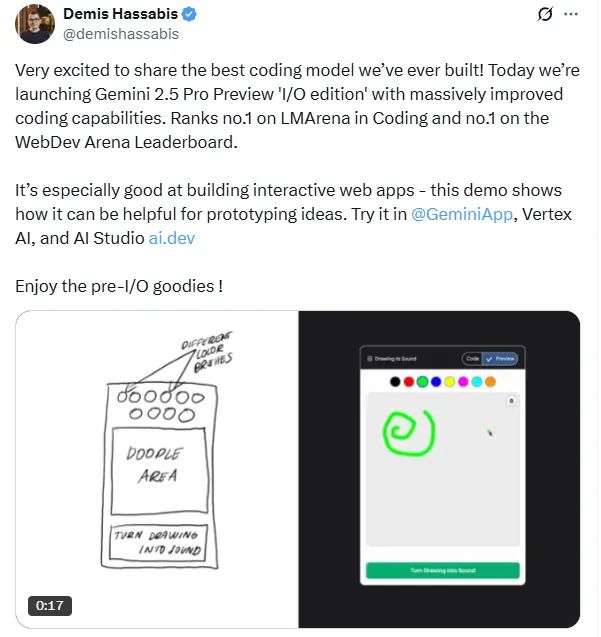 凭借其在代码生成与多模态输入方面的优势,Gemini 2.5 Pro不再仅是技术实验室中的“研究模型”,而是正在成为应对真实开发挑战的实用工具。此次提前发布也表明,DeepMind有意借此响应市场需求,在 I/O大会前持续保持技术领先势头。