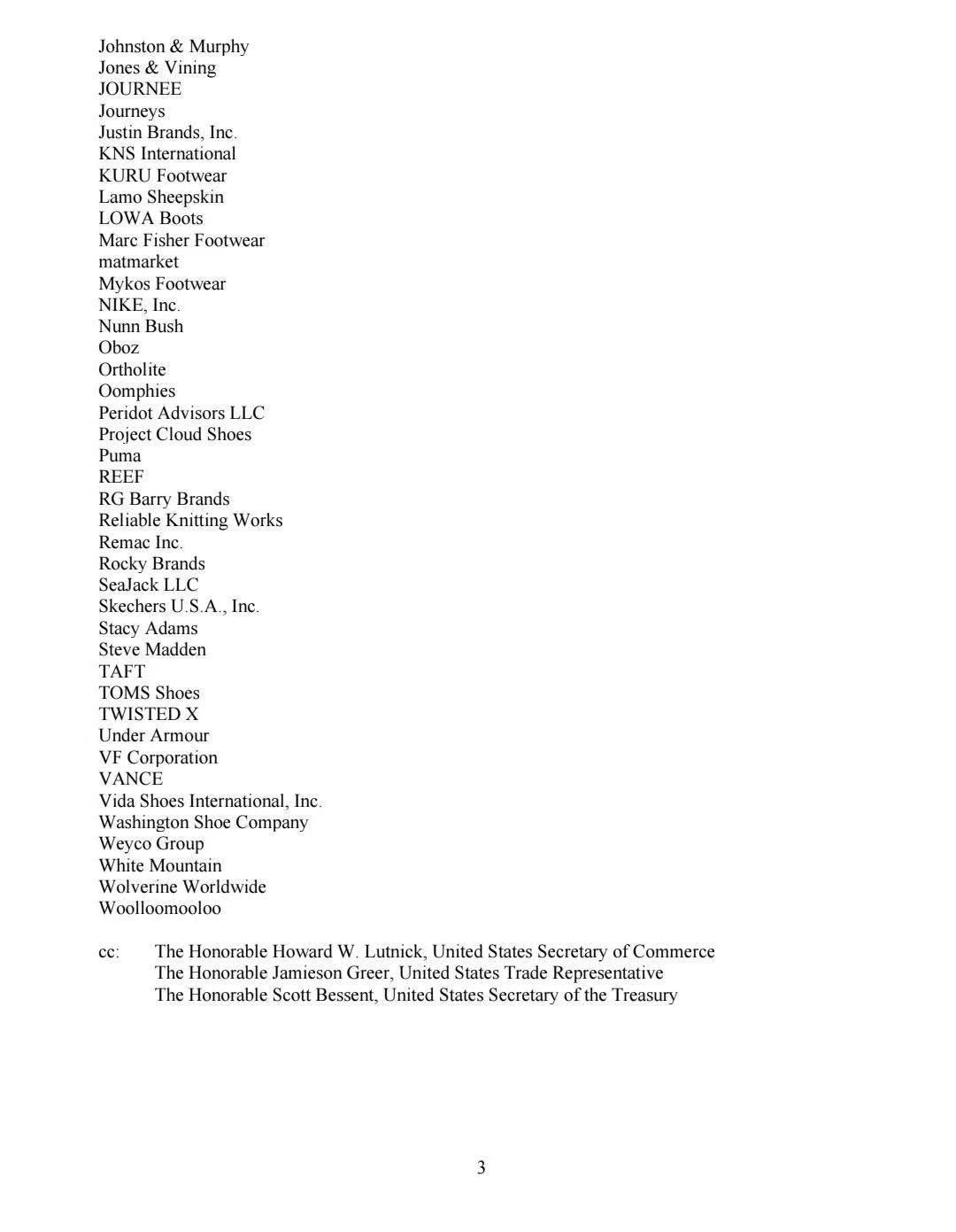 这次不是一个品牌,而是美国鞋类分销商和零售商协会(FDRA)牵头,耐克、阿迪达斯、斯凯奇、安德玛等76个品牌联署写信请求豁免“对等关税”政策,避免企业倒闭。