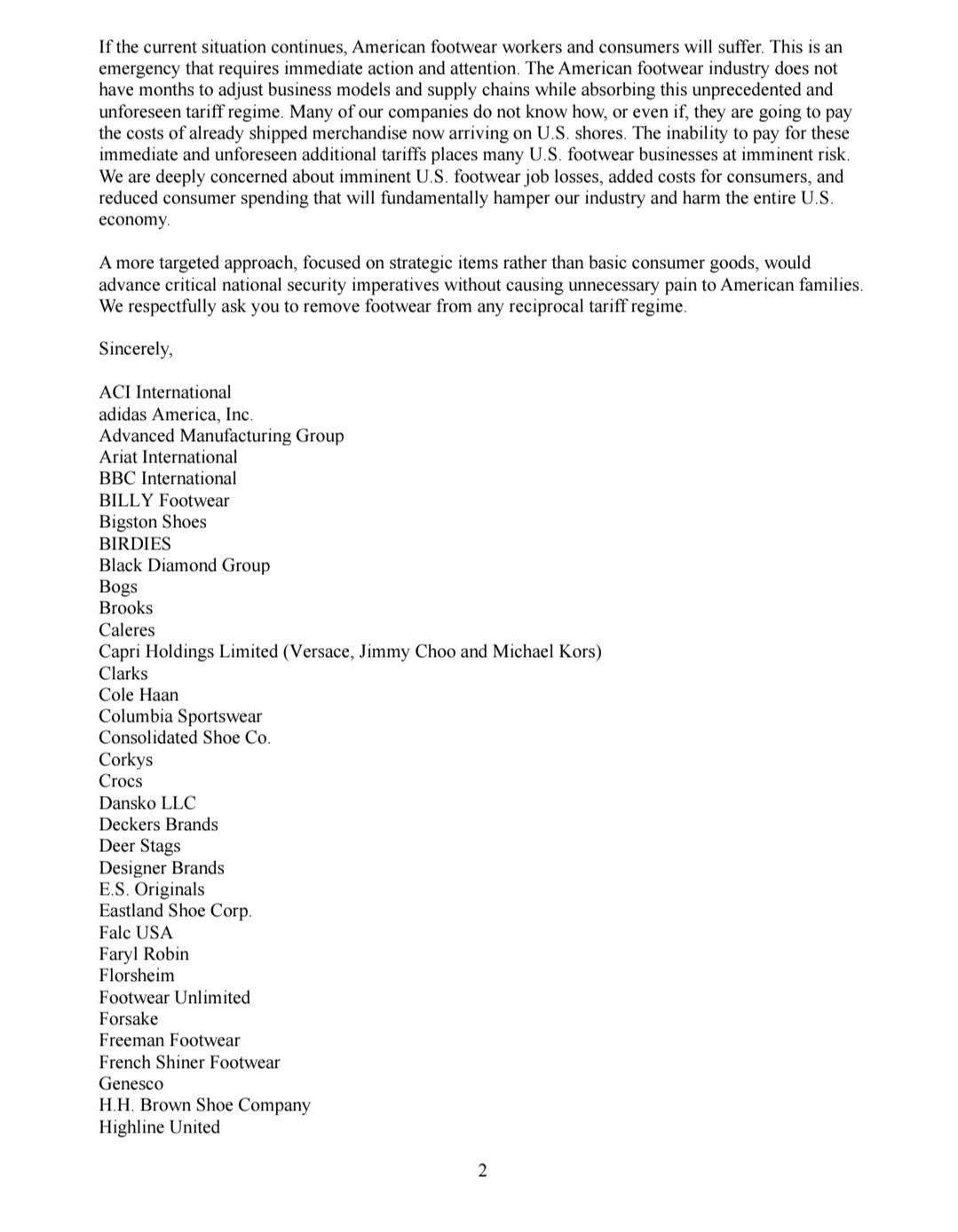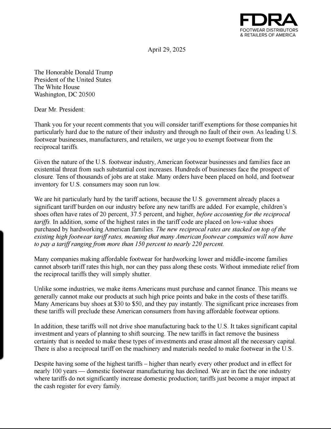 这封联名信里强调,平价鞋类公司无法承受高达150%-220%的综合关税(原有税率已为20%-37.5%),且无法转嫁成本;而且很多订单也因为关税不确定性而搁置,导致鞋类库存未来几个月可能会面临短缺。