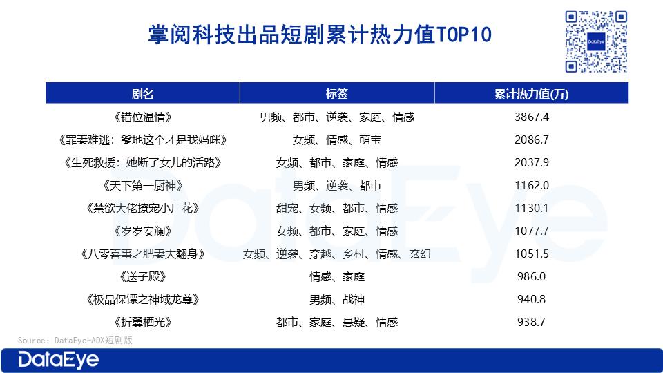 根据 DataEye-ADX 行业版数据显示,掌阅在国内市场累计关联微短剧数量达1304 部,投流累计热力值突破7.54 亿,其中单部热力值超 1000 万的短剧共有 7 部。