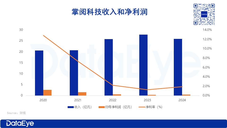 掌阅科技2024年度总营收25.83 亿元,同比微跌 7.02%,归母净利润 4929.17 万元,同比增长 41.46%。