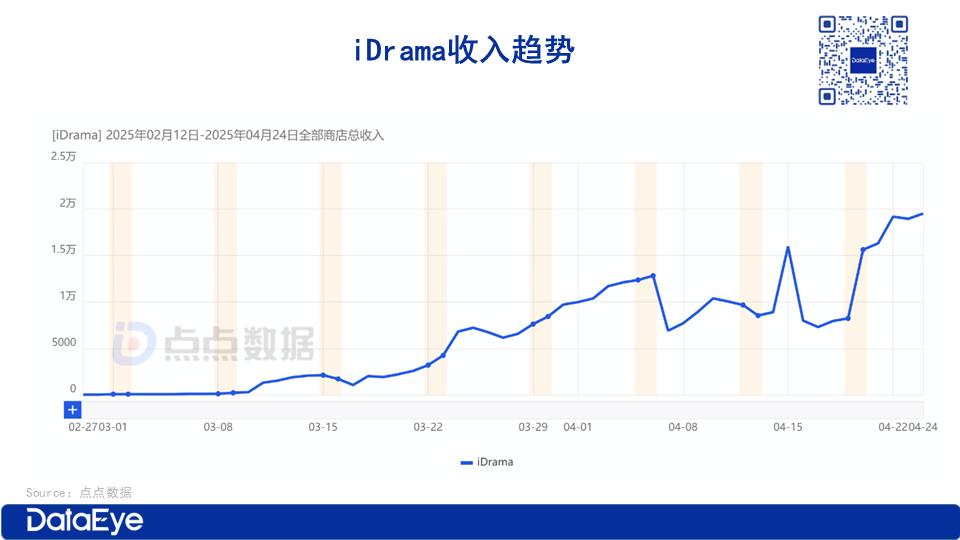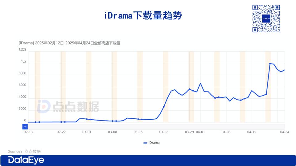 根据点点数据统计,iDrama 于2025 年 2 月 12 日正式上线,截至目前全球双端内购收入达 36.56 万美元(折合约 266.5 万人民币),双端下载量超 19 万次,当前单日收入约 2 万美元,单日下载量约 1 万次,仍处于稳定增长的爬坡期。