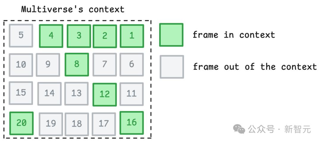 为了在维持上下文长度的同时,获取更长的时间跨度信息,Multiverse对之前的帧和操作进行了稀疏采样。