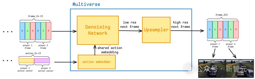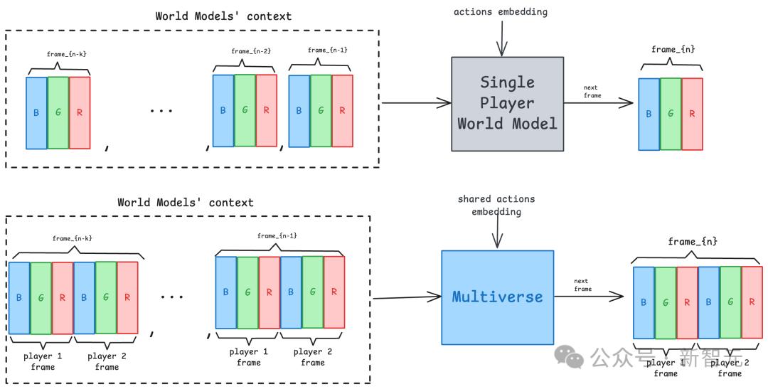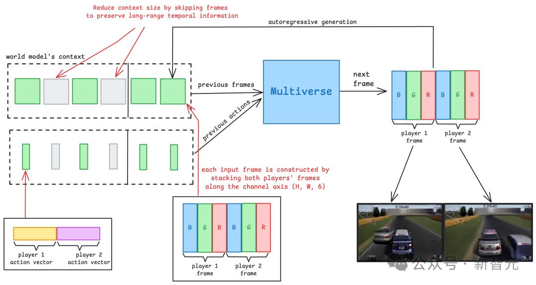 要创建多人游戏体验,模型需要接收两个玩家的前几帧画面和动作,并为每个玩家都要输出预测帧。