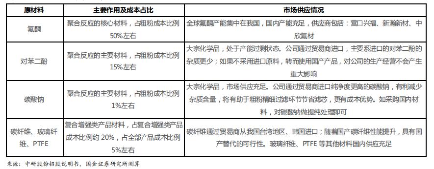 PEEK上游原材料主要包括氟酮、对苯二酚、二苯砜、碳酸钠等。其中的氟酮为PEEK核心原料,占生产成本的50%以上,每生产1吨PEEK需消耗0.7-0.8吨DFBP。
