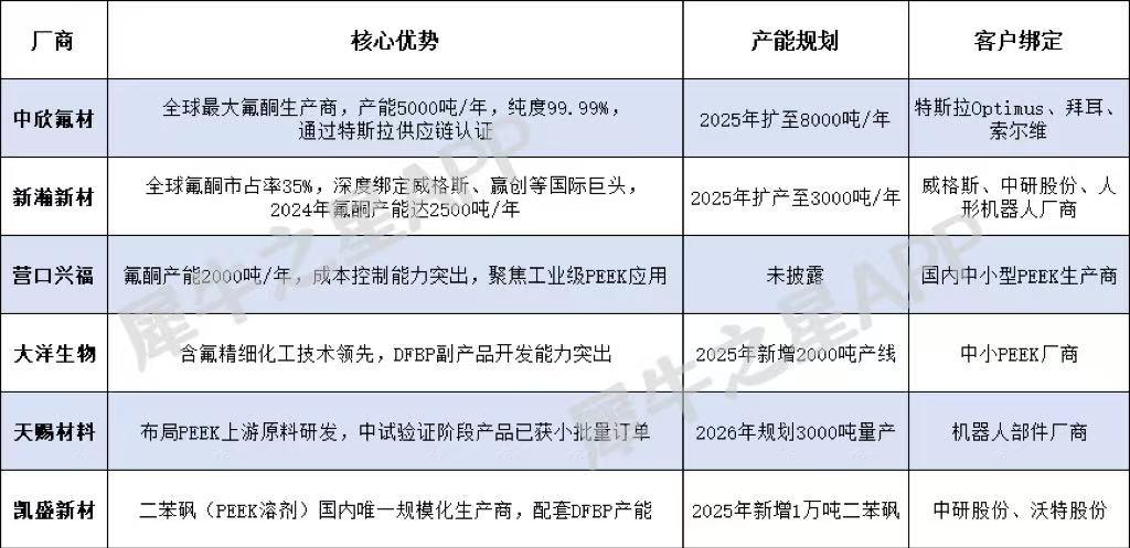 根据券商研报测算2025年国内PEEK总产能预计突破1.2万吨,对应DFBP需求约8400-9600吨;人形机器人单台需求6.6-8kg PEEK,2030年全球产量若达150万台,仅此领域年需求将超1.2万吨。