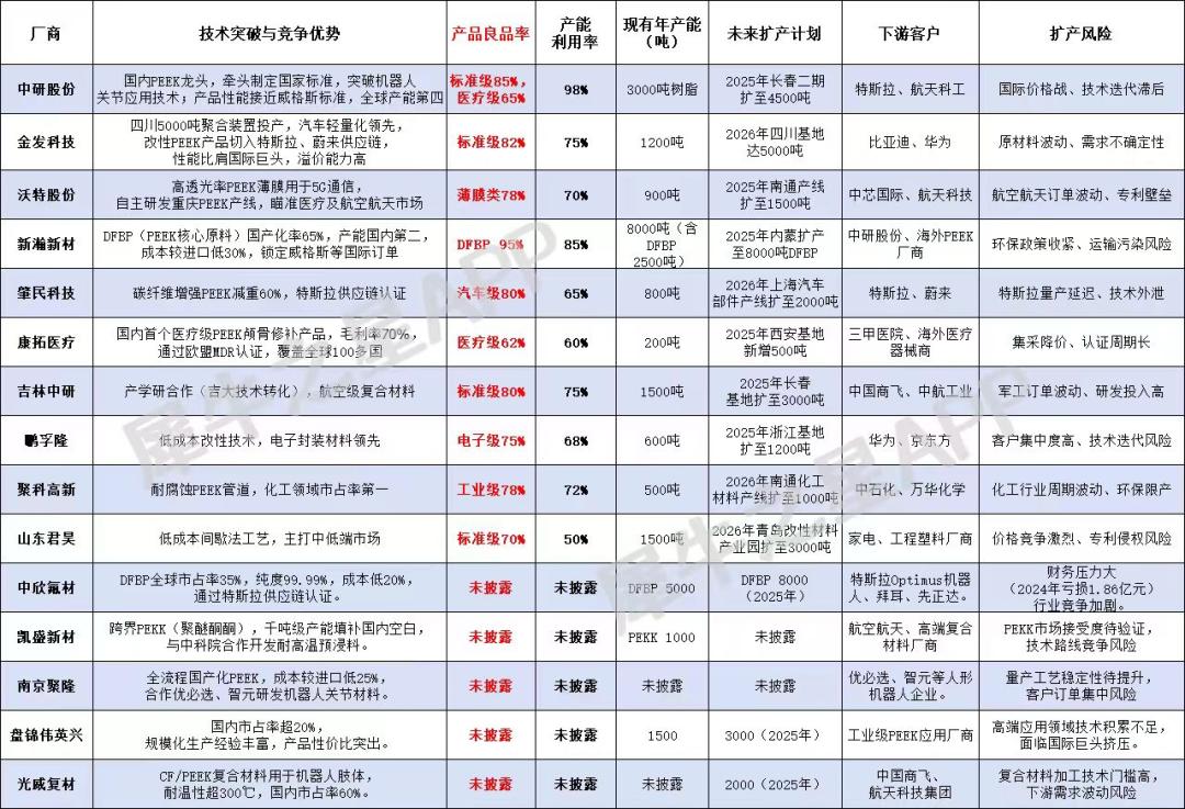 凭借工艺突破+成本优势,国内peek厂商正在加速扩产,未来有望快速崛起提升国产替代率。当下国内生产厂商正在建设PEEK材料的产能,2025年中国PEEK总产能预计突破1万吨,占全球40%。如中研股份、金发科技等龙头已形成技术护城河,但未来需警惕国际竞争加剧、产能过剩及政策退坡三重风险,2025-2026年将是行业整合关键期。