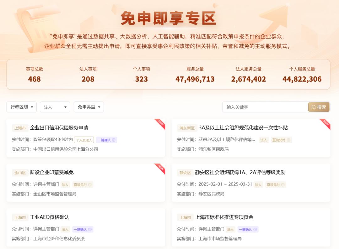 2025年4月3日,上海发布《上海市促进专精特新中小企业发展壮大的若干措施》,提出针对专精特新中小企业的各类奖励,均主打免申即享、直达快享,政策“看得懂、查得到、用得上”;2024年2月发布的《上海市优化政务服务提升行政效能深化“一网通办”改革行动方案(2024年~2026年)》也提到,将推行少填少交智能审,构建全市统一的知识图谱,完善“免申即享”制度保障。