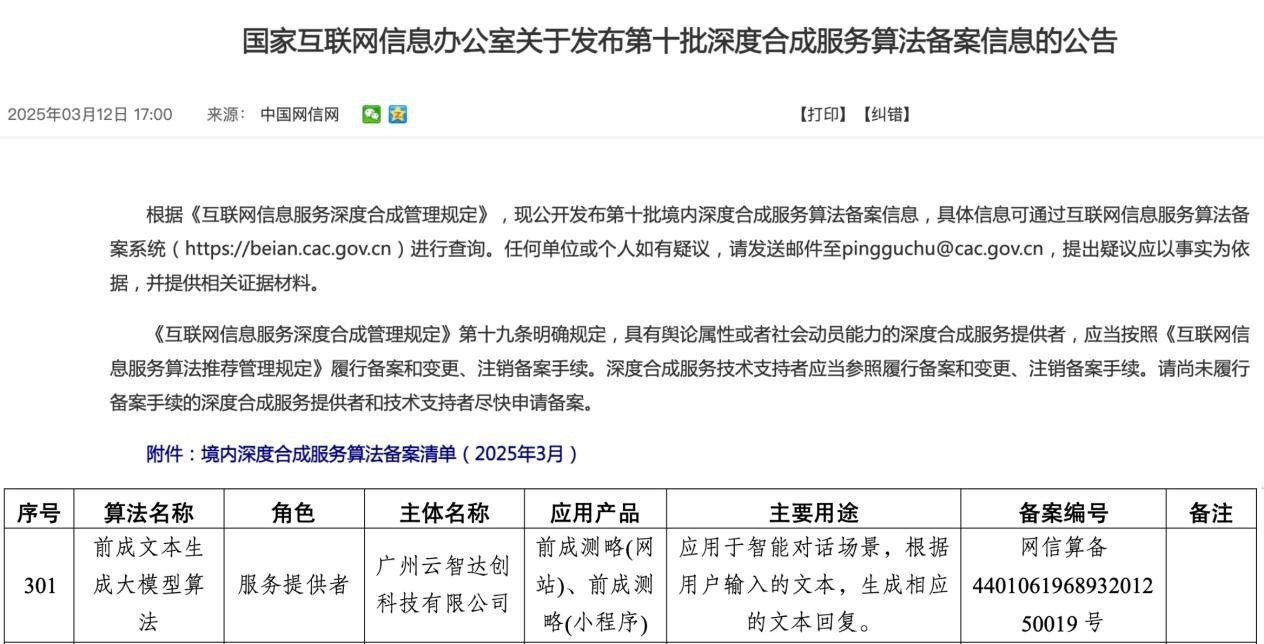 备案要求覆盖算法、算力、数据管理全技术链,例如需满足生成内容准确性(如推理准确率≥96%)和意图识别能力(≥85%)等硬性标准。前成通过国家级技术、安全与合规审核,获国家网信办备案认证,是技术实力的权威背书,也是切实强化客户对云智科技的技术信任。