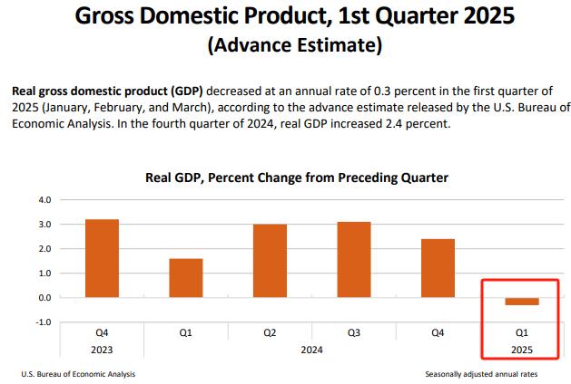 美国商务部上周公布的数据显示,2025年第一季度,美国国内生产总值(GDP)环比按年率计算萎缩0.3%。这是2022年以来美国经济的最差季度表现。稍早公布的数据也显示,美国4月密歇根大学消费者信心指数终值录得52.5,创2022年8月以来新低,不及预期的53.5,也低于3月的57。