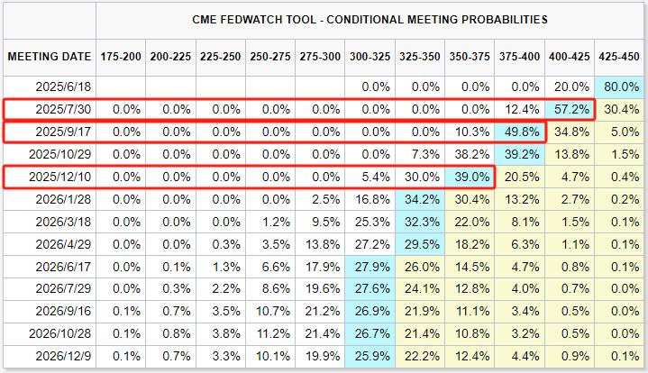 据芝商所“美联储观察”,截至发稿,交易员认为美联储年内将进行3次25个基点的降息,分别在7月、9月和12月的会议上。也就是说,交易员目前认为美联储年内总计将降息75个基点,年底的联邦基金利率区间将降至3.50%至3.75%。