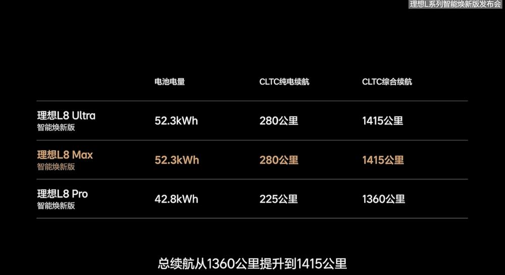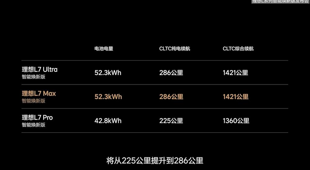 升级后的理想L7 Max,CLTC纯电续航将从225公里提升至286公里,总续航从1360公里提升至1421公里。理想L8 Max的CLTC纯电续航将从225公里提升至280公里,总续航从1360公里提升至1415公里。