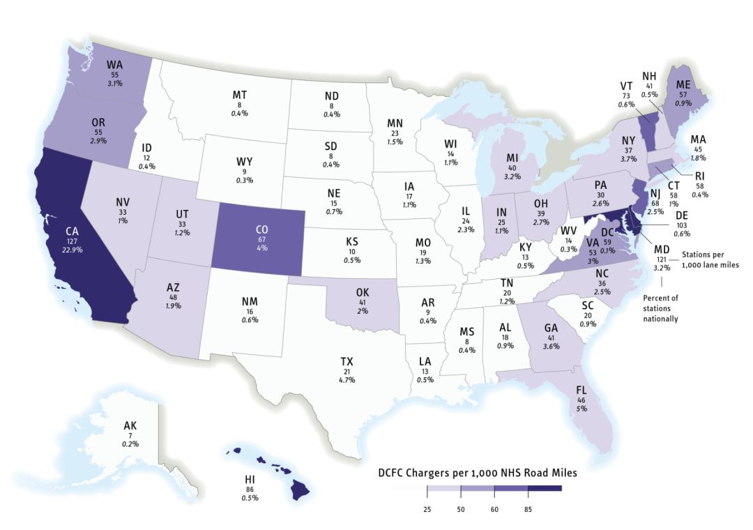 美国各州每 1610 公里(1000 英里)公路的快充站覆盖率|图源: 美国交通统计局