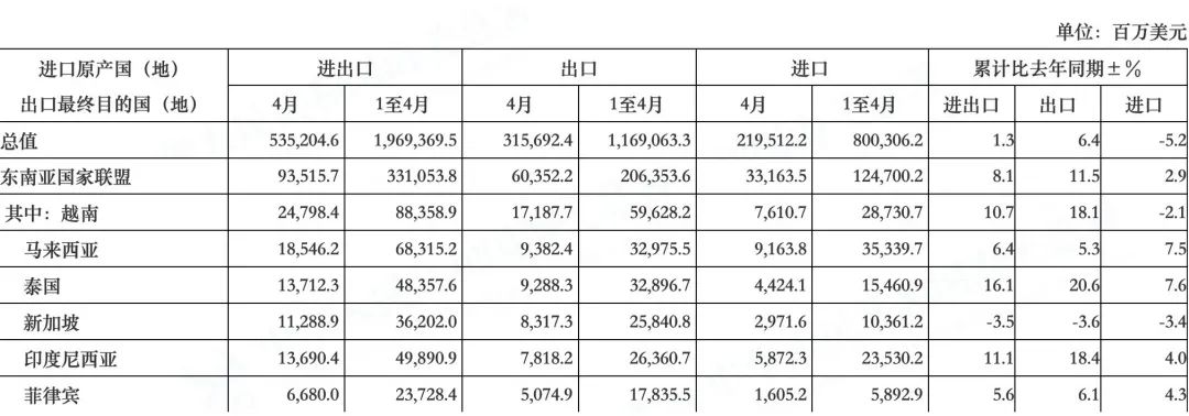 △1-4月我国对东盟国家进出口数据,图源:海关总署官网