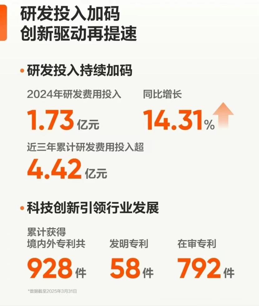 2022年以来,华宝新能累计研发投入4.42亿元。其中,2024年研发费用1.73亿元,同比增长14.31%。