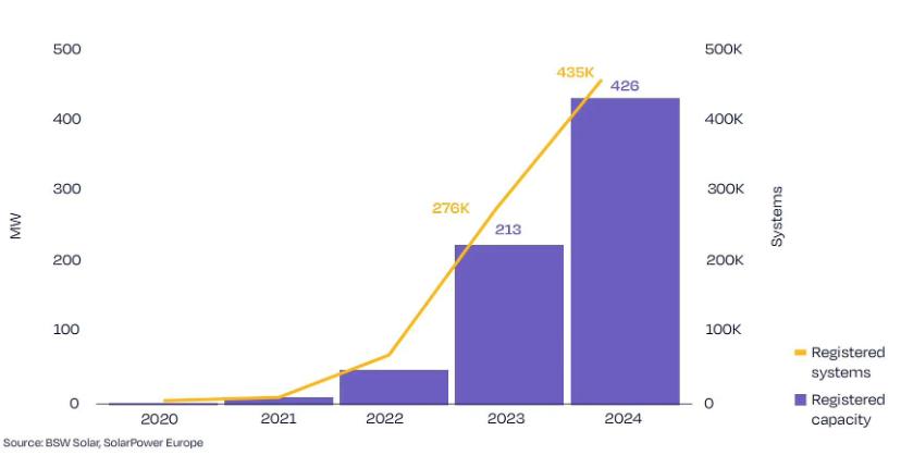 报告显示,2024年,德国共注册了43.5万套阳台光伏,容量达到 426MW。相比2022-2023年,实现了爆发式增长。