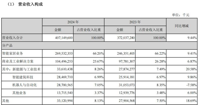同理,美的老牌智能家居业务更没有外行所见的那样式微、不堪,2024年9.4%的营收增速便是最好的明证。