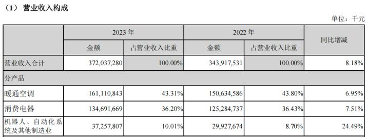 2021至2023年,美的各业务营收增长最快的是机器人与自动化业务,增速分别为9.7%与24.5%。但整体体量较小,2023年的373亿营收,只占美的全部营收的10%。