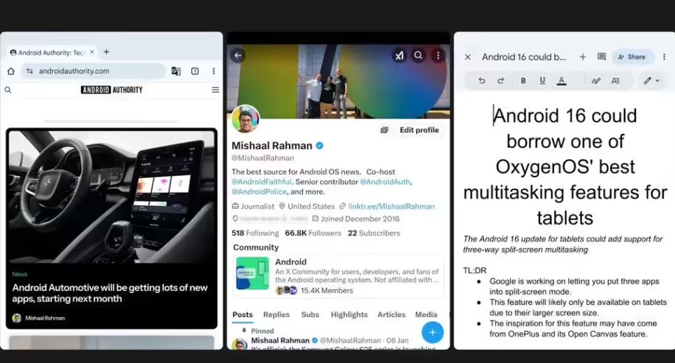 谷歌这边也没闲着,除了迷你任务栏外,他们还会在Android 16中升级分屏模式,全新的分屏模式将支持同时最多运行3款应用程序,其中,两个应用程序共享90%的屏幕,第三个应用程序占据剩余的10%,只需点击应用程序窗口的任何位置即可快速将其放大。