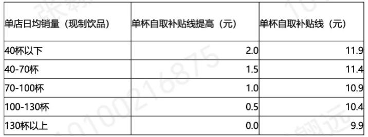 一是下沉市场门店培养补贴,补贴范围涵盖地级以上城市的远郊区县及其下辖乡镇门店。如果门店单店日均销量低于40杯,每一杯到店(即自提单)多补贴2元,补贴至11.9元;如果在40-70杯,每一杯到店多补贴1.5元,补贴至11.4元;130杯以上则取消补贴,因为这也基本到达了门店的盈亏平衡点。
