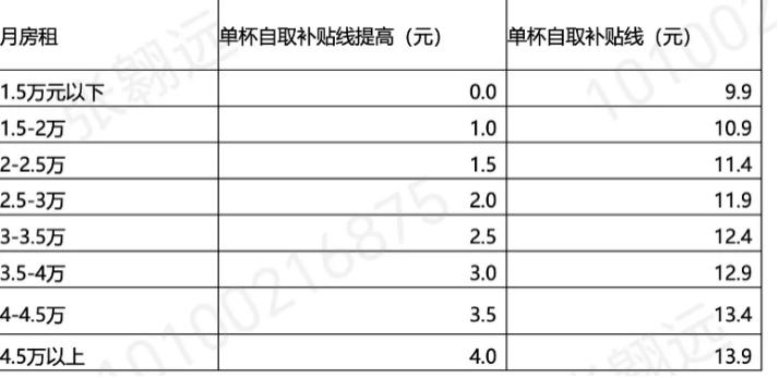 二是针对高租金的优质点位给出的高房租补贴。门店月租金在1.5万-2万元的,每一杯到店多补贴1元,补贴至10.9元;2万-2.5万元租金的,每一杯到店多补贴1.5元,补贴至11.4元;4.5万租金以上的门店,到店每一杯多补贴4元,补贴至13.9元。